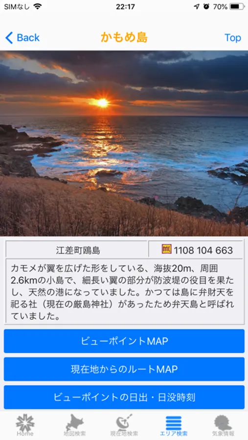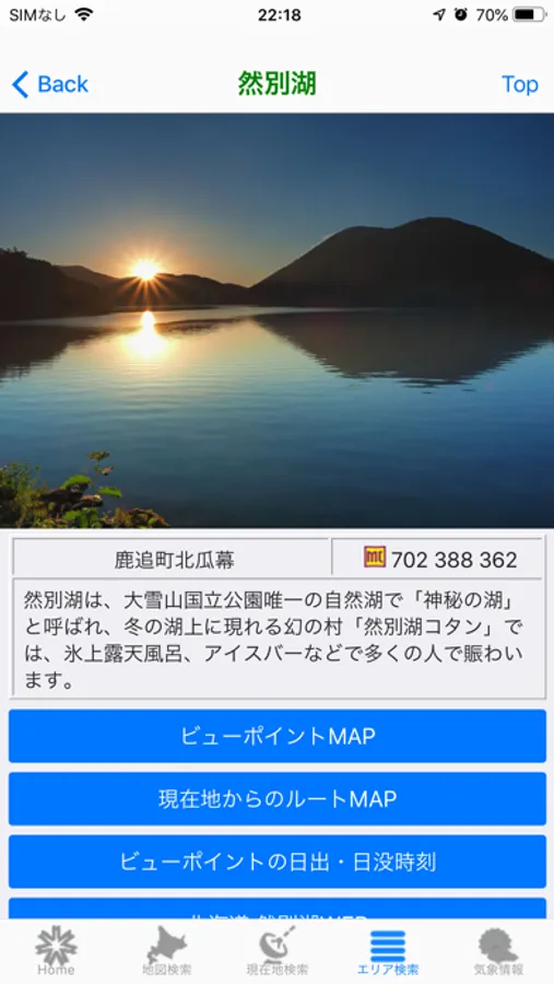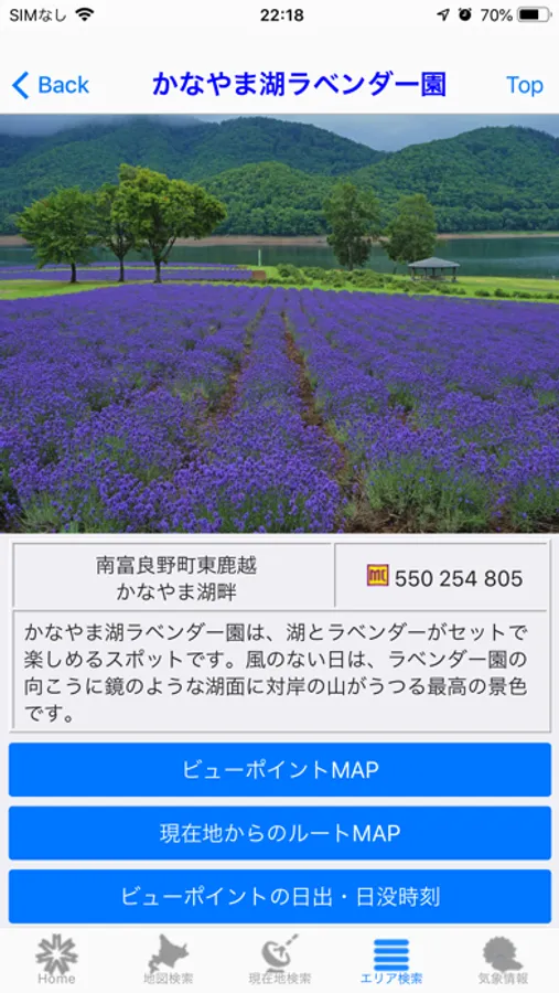 「道央エリア」「道南エリア」「道北エリア」「十勝エリア」「オホーツクエリア」「釧路・根室エリア」の6つのエリア毎にビューポイント名を一覧表示します。ビューポイント名をタップすると、ビューポイント情報が表示されます。