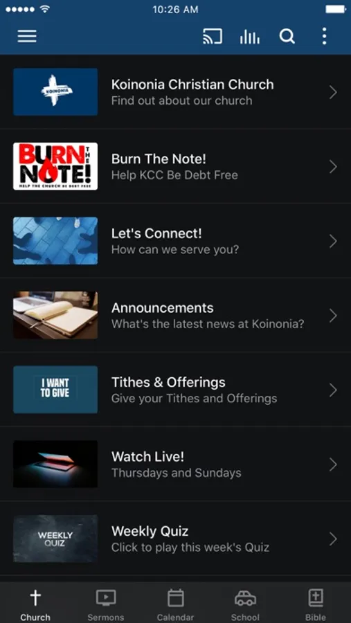 The Koinonia Christian Church app was developed with the Subsplash App Platform.