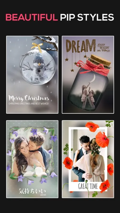 PIP Camera sets your photo in another photo frame with some creative frames. PIP Camera is popular Pic-in-Pic mode, and it is more powerful and more fun with the addition of the new PIP Frames mode and beautiful Photo Collage mode.