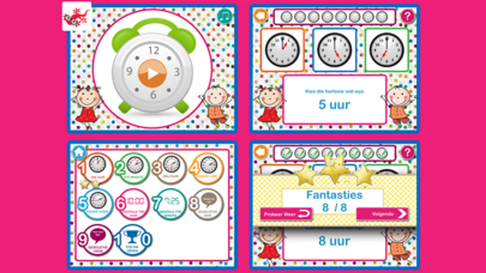 Met die app (speletjie) kan jou kind na vlak een vorder tot by vlak tien. Jou kind kan leer van Analoog tyd, Digitale tyd en Geselstyd in een speletjie. Jy het ook die opsie om die speletjie te herstel, sodat jou kind weer deur elke vlak kan gaan.