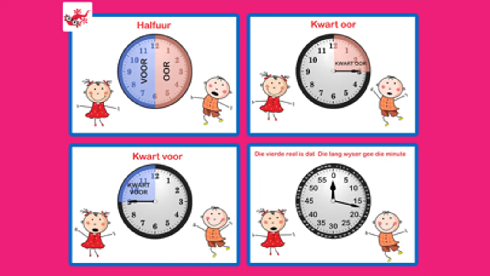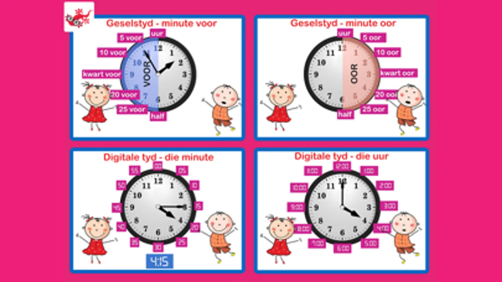 Die oefeninge en aktiwiteite in hierdie app help kinders om maklik en met pret te leer sê hoe laat dit is - die ideale voorbereiding vir skool.