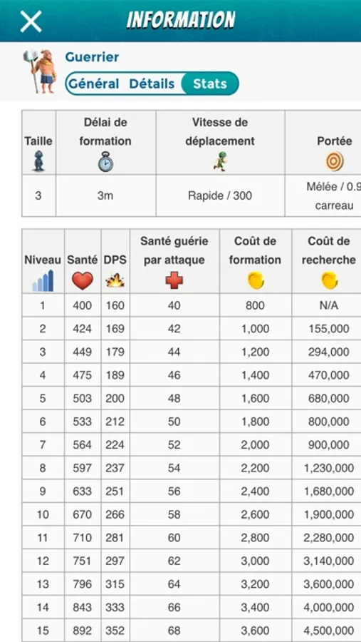 - et bien sûr les statistiques associées : santé disponible par niveau, vitesse d'attaque, coût et durée d'amélioration, ...