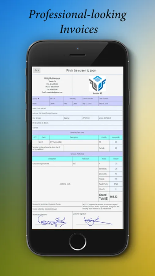 - Signature. Register your signature once on the device, and then use it to sign all your estimates and invoices. Your client can also sign the invoice right on your phone or tablet.