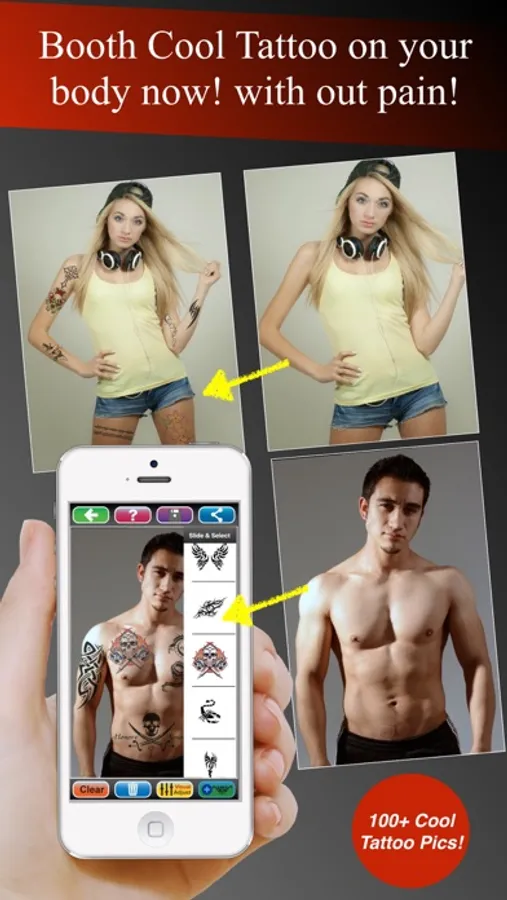 You will be able to create beautiful tattoo, try before real tattoo, get tattoo ideas and fun with Tattoo Booth My Photo!