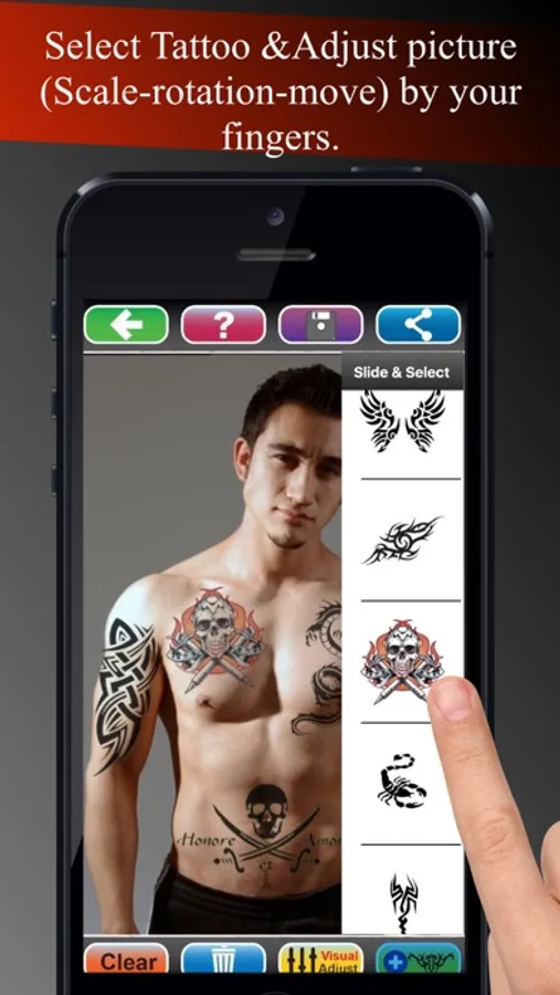 4. Use your fingers for adjust (scale-move-rotation) tattoo item by one finger for move and two fingers for scale and rotation.