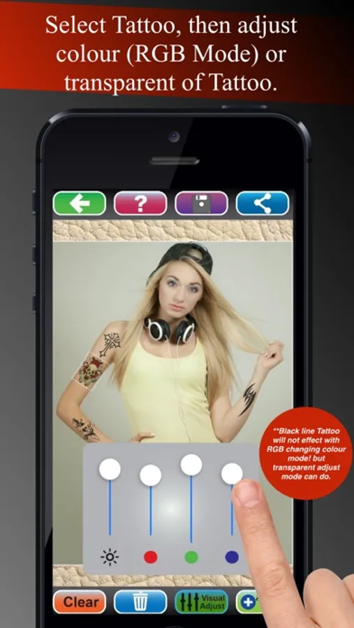 7. Tap "Visual Adjust Button" for open/close "Visual Adjust Panel" by this panel user can adjust transparent and Tattoo's color.