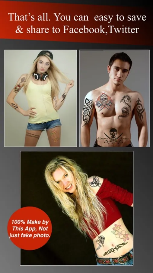 More realistic with transparent & color change function (RBG Mode), When a your picture with tattoo is good looking,it easy to save images & share to Twitter, Facebook.