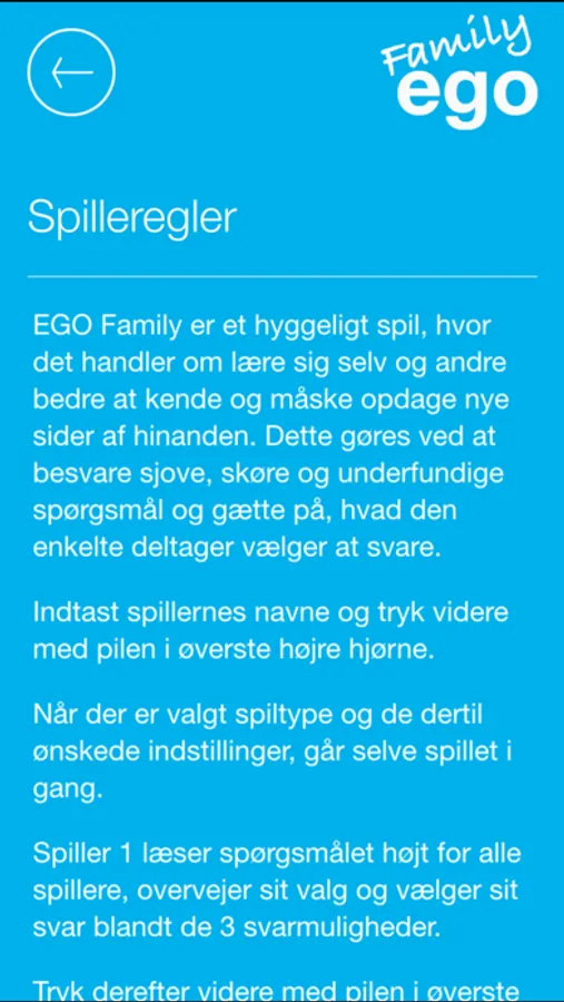 EGO Family er et hyggeligt familiespil, der kan spilles af op til 8 deltagere på bare én iPhone eller iPad. Spillet bygger på det kendte brætspil, men spørgsmålene er helt nye og anderledes.