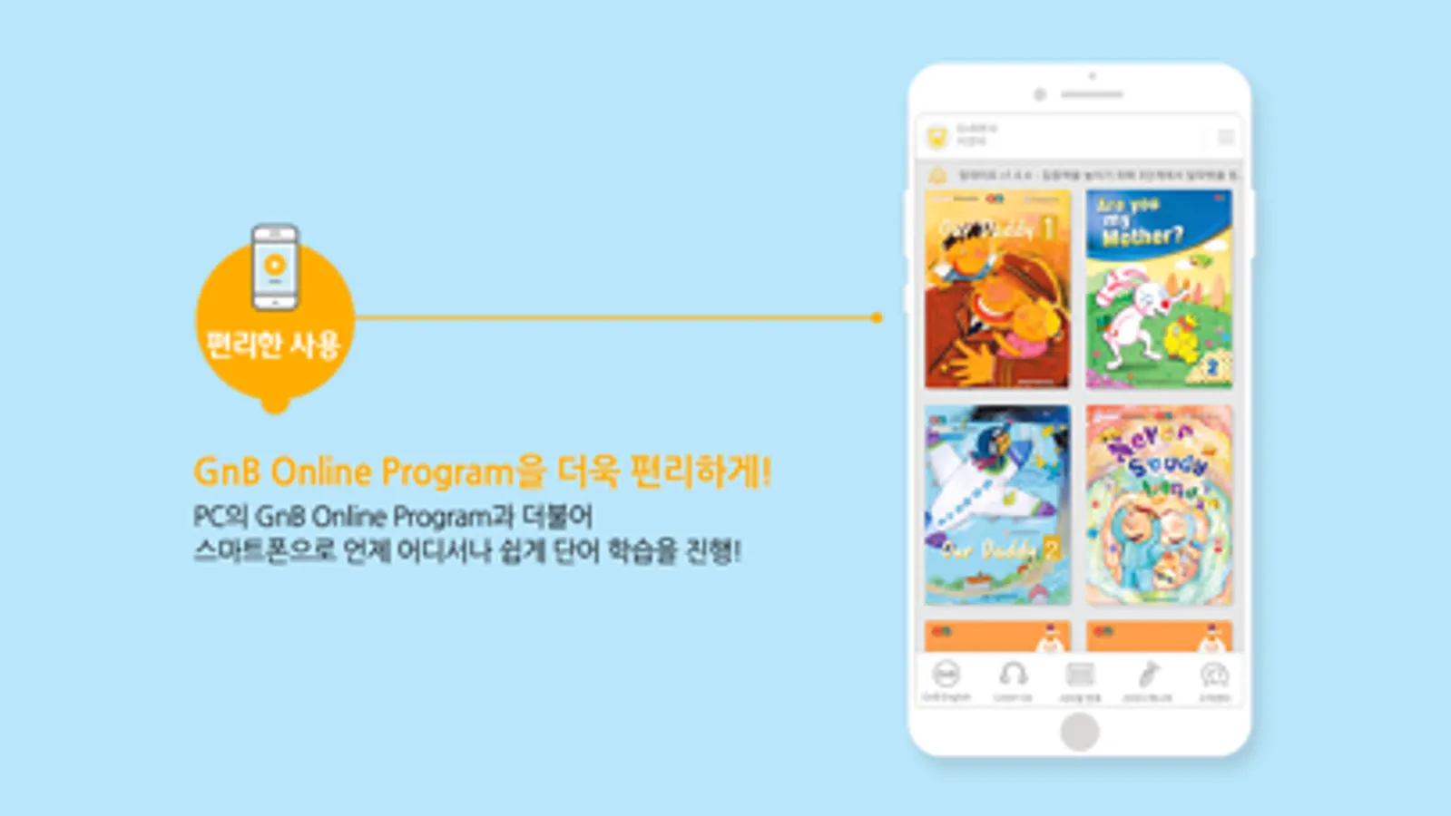 PC의 GnB Online Program과 더불어 스마트폰으로 언제 어디서나 쉽게 단어 학습을 진행할 수 있습니다.