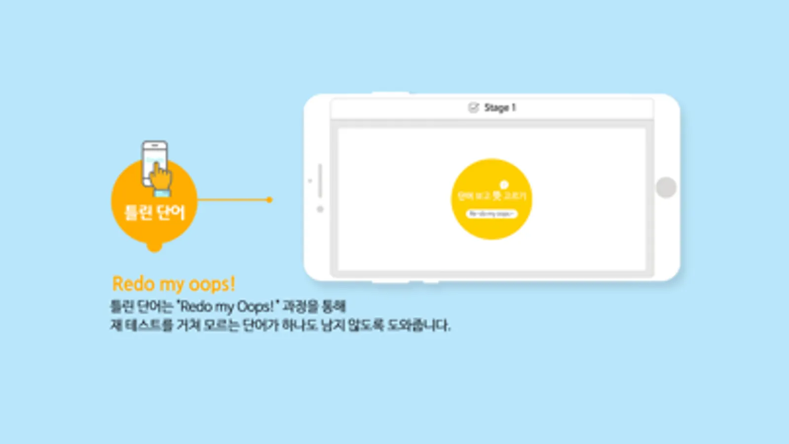 각 테스트 단계에서는 틀린 단어는 "Redo my Oops!" 과정을 통해 재 테스트를 거쳐 모르는 단어가 하나도 남지 않도록 도와줍니다.