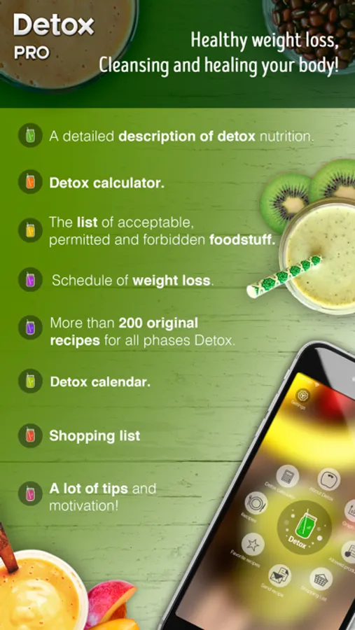 Our application Detox Pro will be indispensable assistant and will motivate you to not only get in shape and achieve a state of purity, a little-known today. There you will find everything you need for an easy and pleasant detox of the body. Namely:
