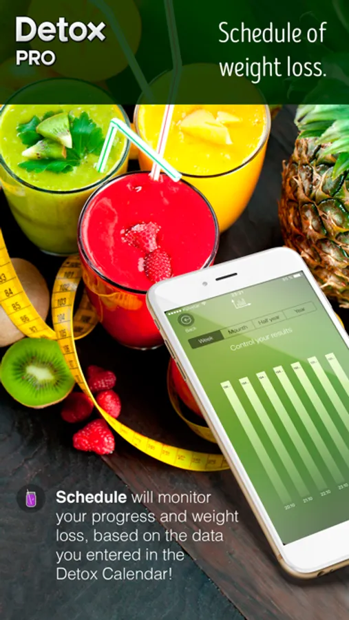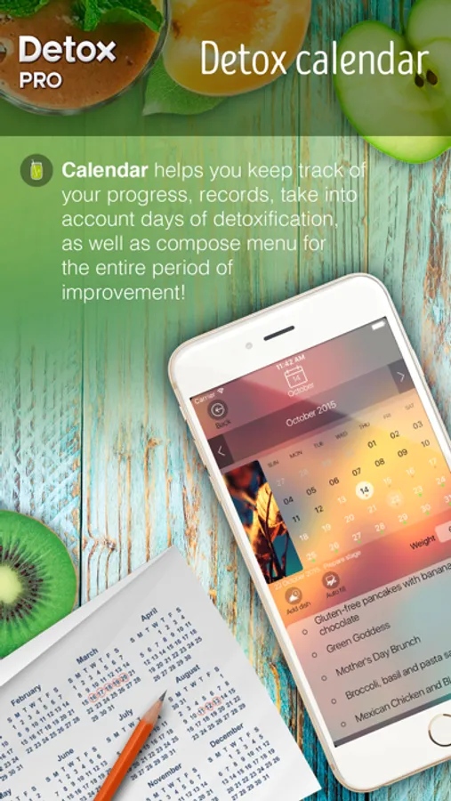 * Detox calendar. Calendar helps you keep track of your progress, records, take into account days of detoxification, as well as compose menu for the entire period of improvement!