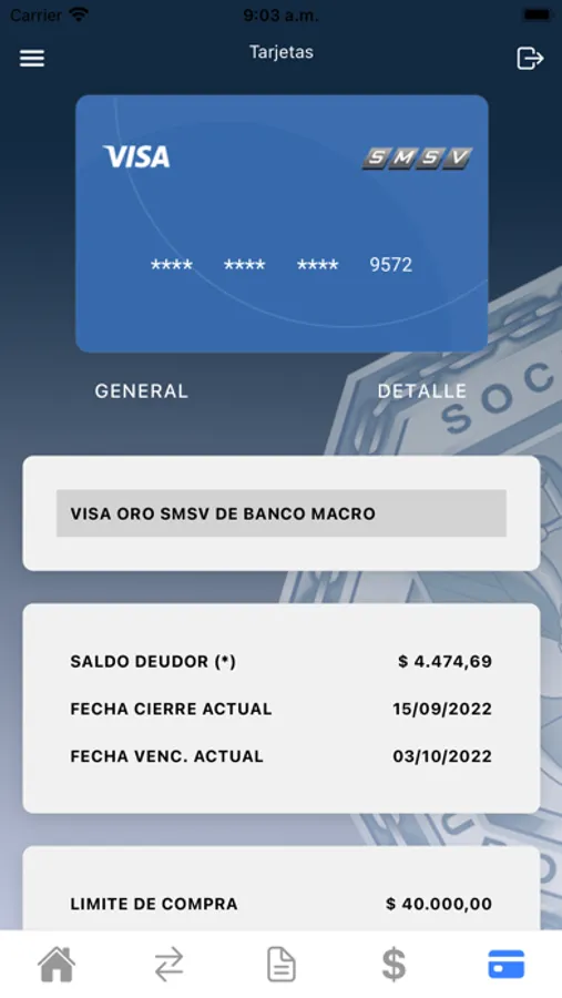 Tarjetas: Límites, vencimiento y saldo de sus tarjetas de crédito Visa y Mastercard.