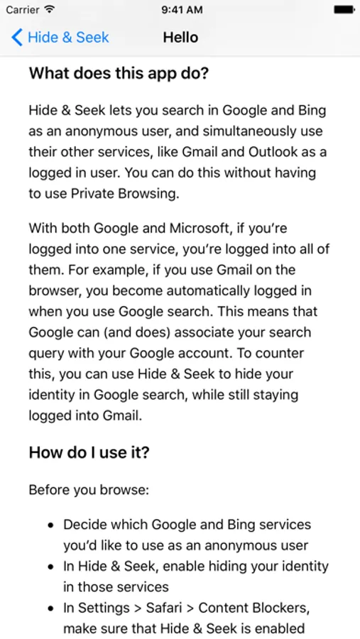 Hide & Seek lets you search in Google and Bing as an anonymous user, and simultaneously use their other services, like Gmail and Outlook as a logged in user. Hide & Seek does this by blocking cookies with a Safari content blocker extension.