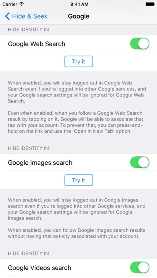 • When using Google Images search on the iPad, when Hide & Seek is hiding your identity for that search, to visit the origin website of the image, you might have to use the ‘Open in New Tab’ option rather than tapping on a result directly.