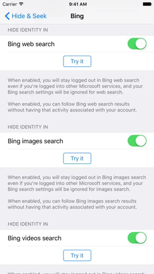 • When you’d like to follow a Bing search result on an iPhone, when Hide & Seek is hiding your identity for that search, you might have to use the ‘Open in New Tab’ option rather than tapping on a result directly.