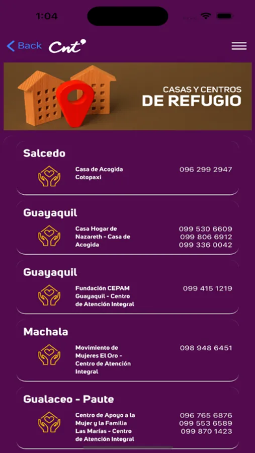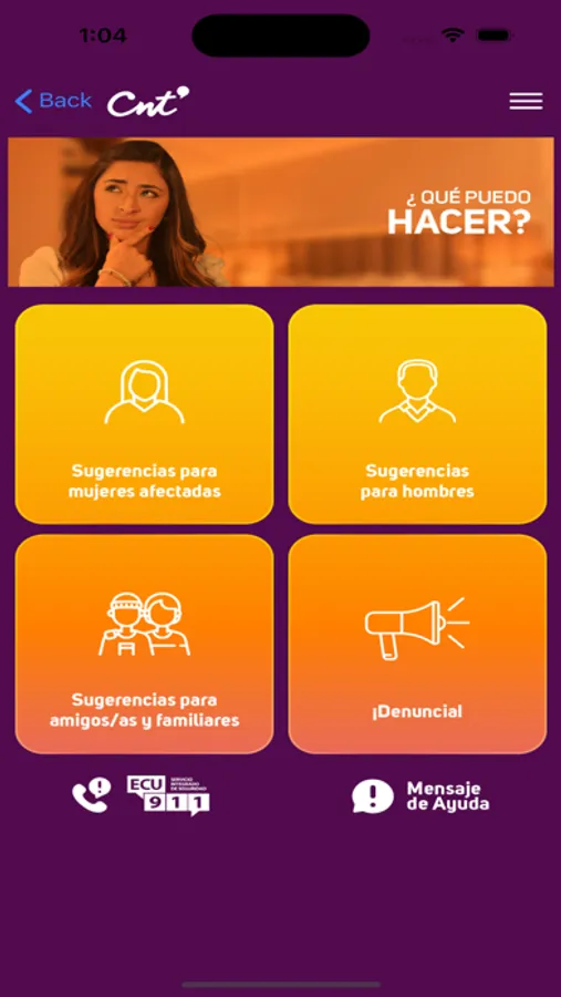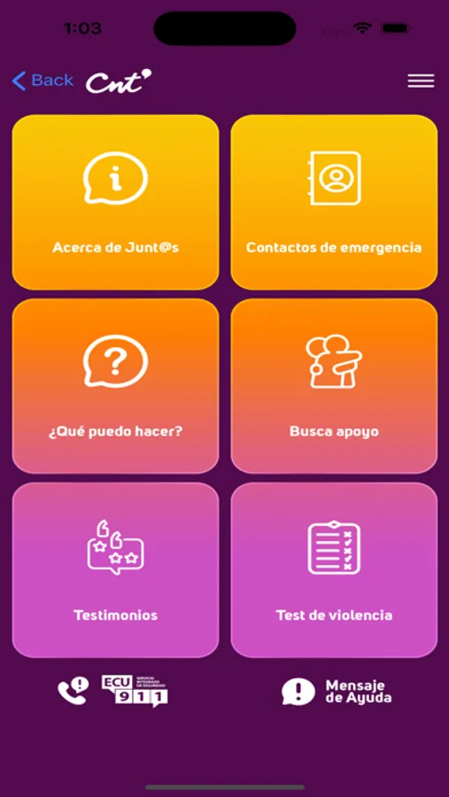 Así también, cuenta con otras funcionalidades de carácter informativo como lo son: Acerca de Junt@s, ¿Qué puedo hacer? que contiene sugerencias para mujeres, hombres y amigos/as o familiares para que sepan cómo actuar en situaciones de violencia contra las mujeres, así también, existe la opción Busca Apoyo que contienen números de casas de acogida y servicios de protección integral que brindarán apoyo a las víctimas.