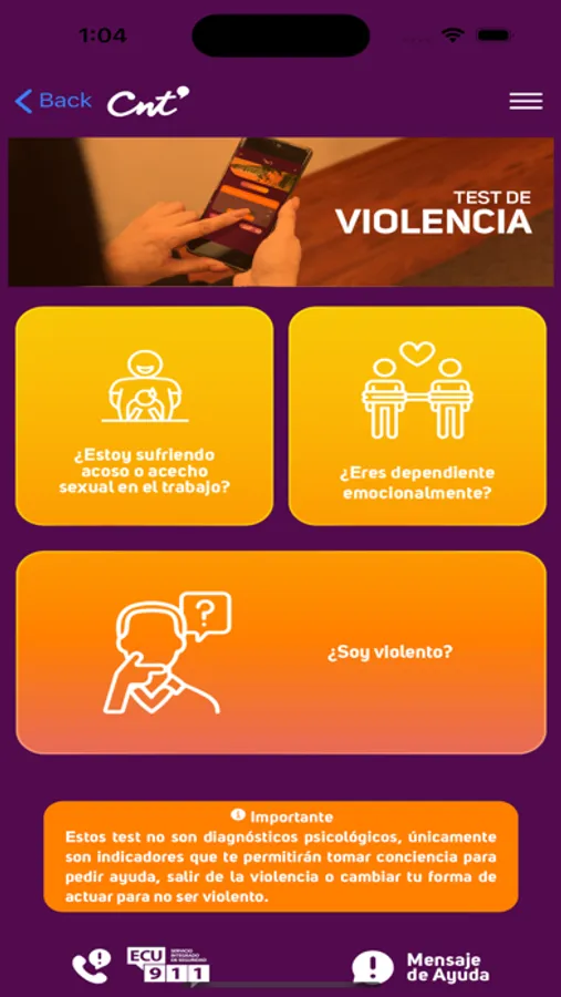 Por otro lado, dentro del menú está Testimonios donde está el Testimonio de una mujer víctima de violencia de género que trasmite un mensaje positivo de superación y por último se cuenta con Test de Violencia que tiene 3 tipos de test para que las personas puedan identificar si sufren de violencia, son violentos o están en relaciones con dependencia emocional, para que soliciten ayuda.