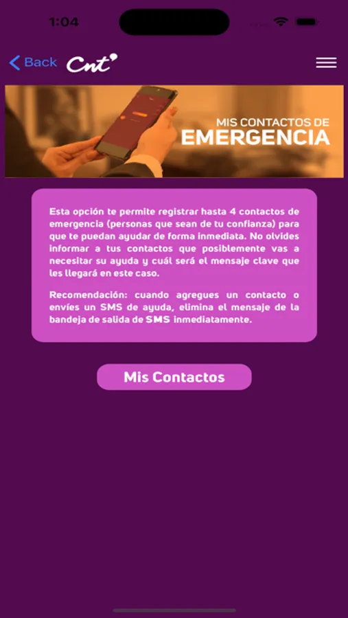 Su funcionalidad principal es el envío de SMS a Contactos de Emergencia previamente registrados en la opción contactos de emergencia con la finalidad de que los usuarios cuando requieran ayuda de sus contactos envíen el SMS con su ubicación para que éste pueda brindarle apoyo.