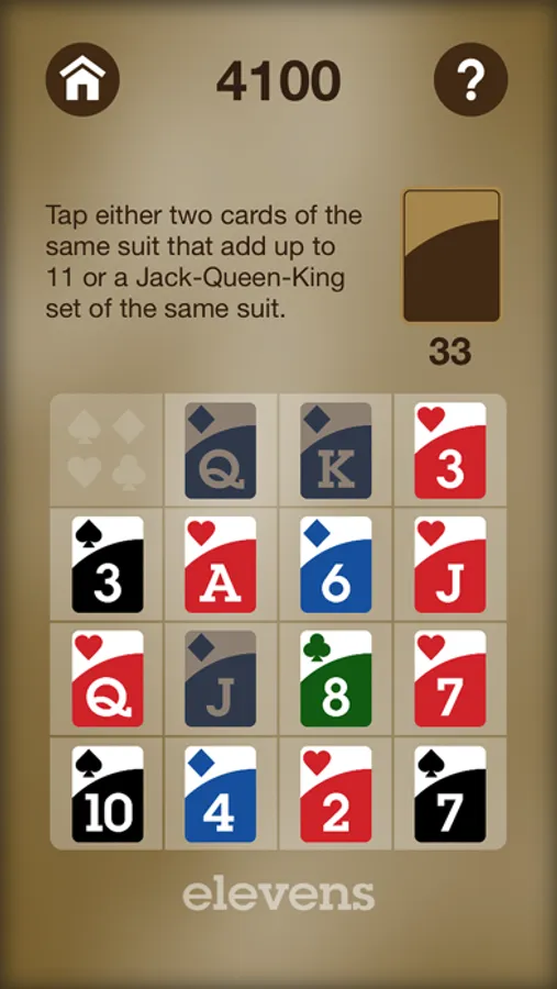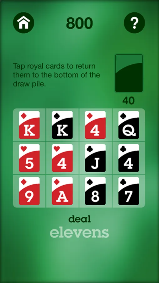 Royals On Top - A simple addition solitaire card game that can be played using either sums of 11 or 10. You win when all the cards are placed on the board with only royal cards on top.