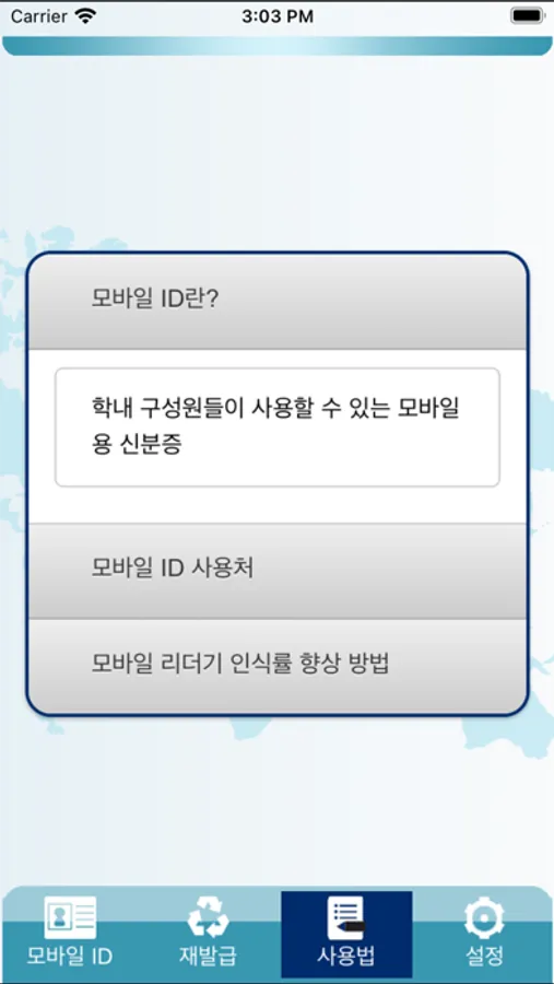 모바일 학생증(신분증) 화면 및 사용법, 신분증 재발급, 설정 메뉴로 구성되어 있습니다.
