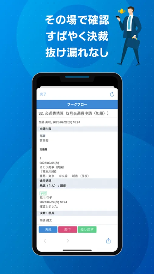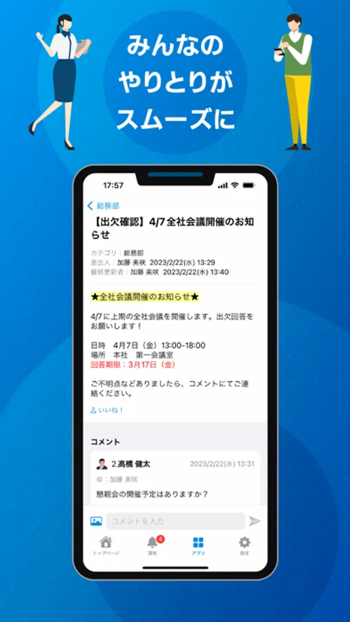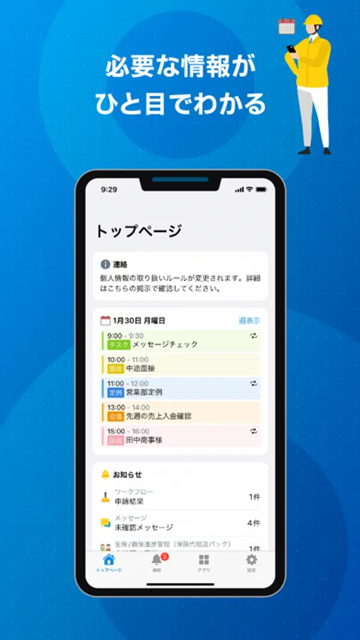 スケジュール、掲示板、ワークフロー(電子決裁)など、社内の情報共有やコミュニケーションを円滑にする機能をご利用いただけます。スマートフォンやタブレットで業務に取り組めるので、外出先・現場・オフィスなど働き方がちがうメンバーとスムーズにやりとりできます。
