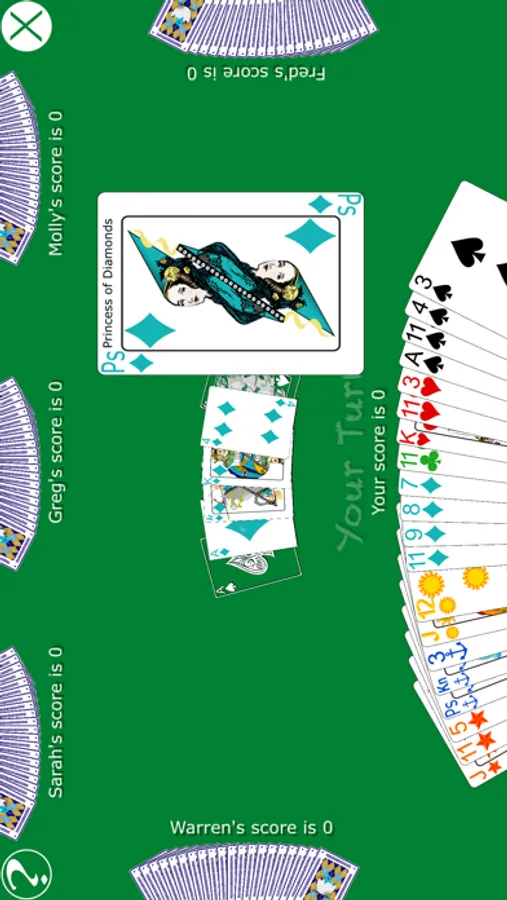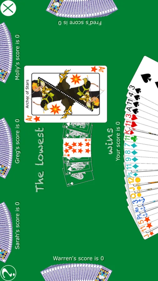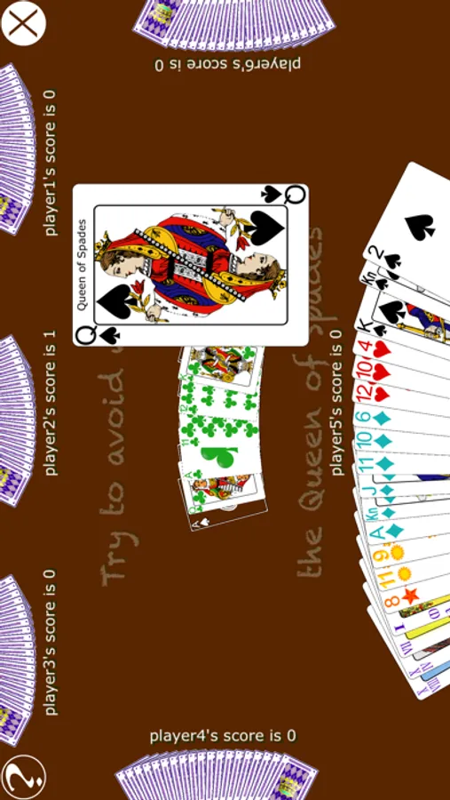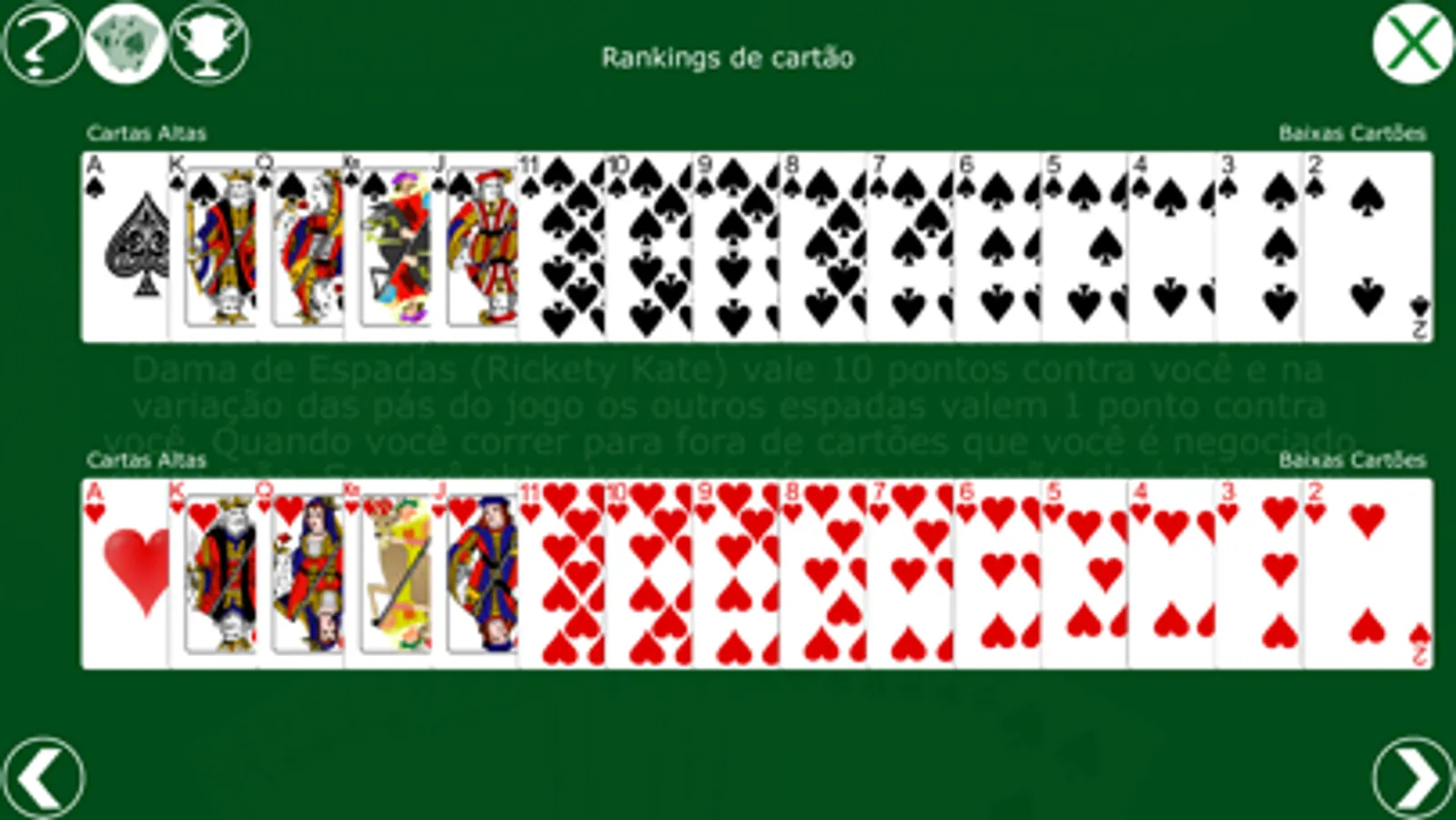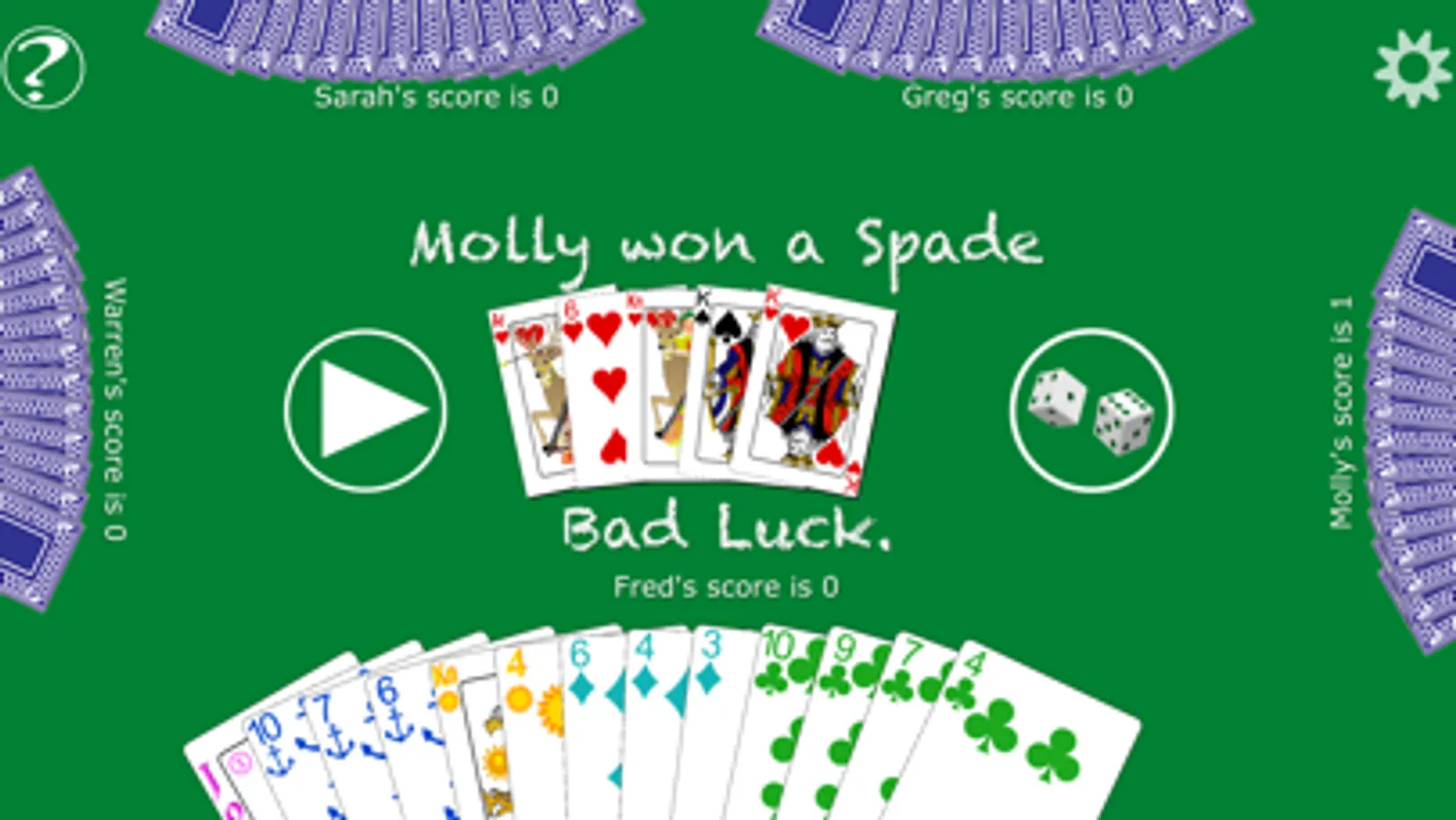 The Queen of Spades (Rickety Kate) is worth 10 points against you and the other spades are worth 1 point against you. When you run out of cards you are dealt another hand.