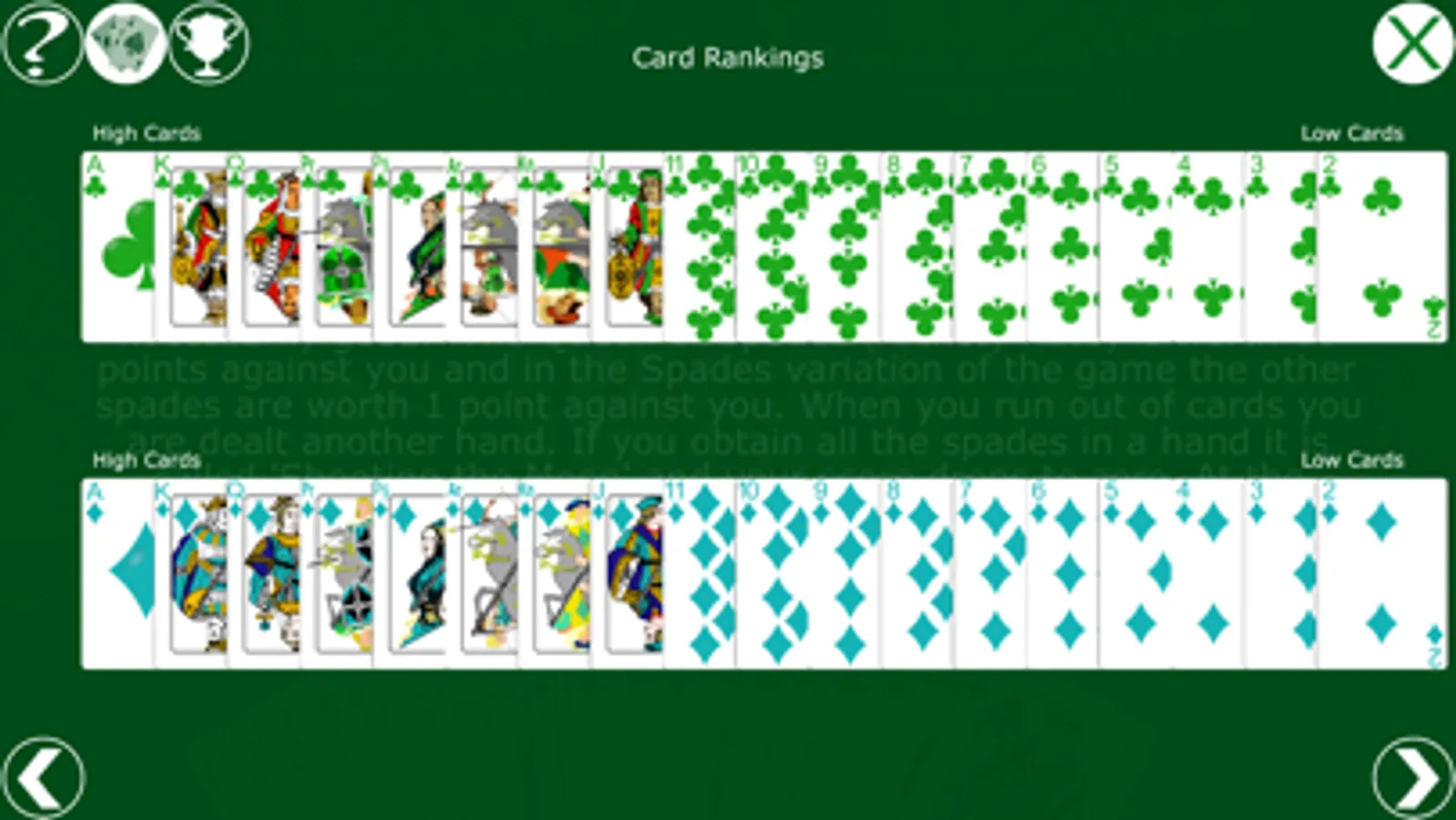 If you obtain all the spades in a hand it is called 'Shooting the Moon' and your score drops to zero. At the beginning of each hand the player pass their three worst cards to their neighbour. Aces and King are the worst cards.