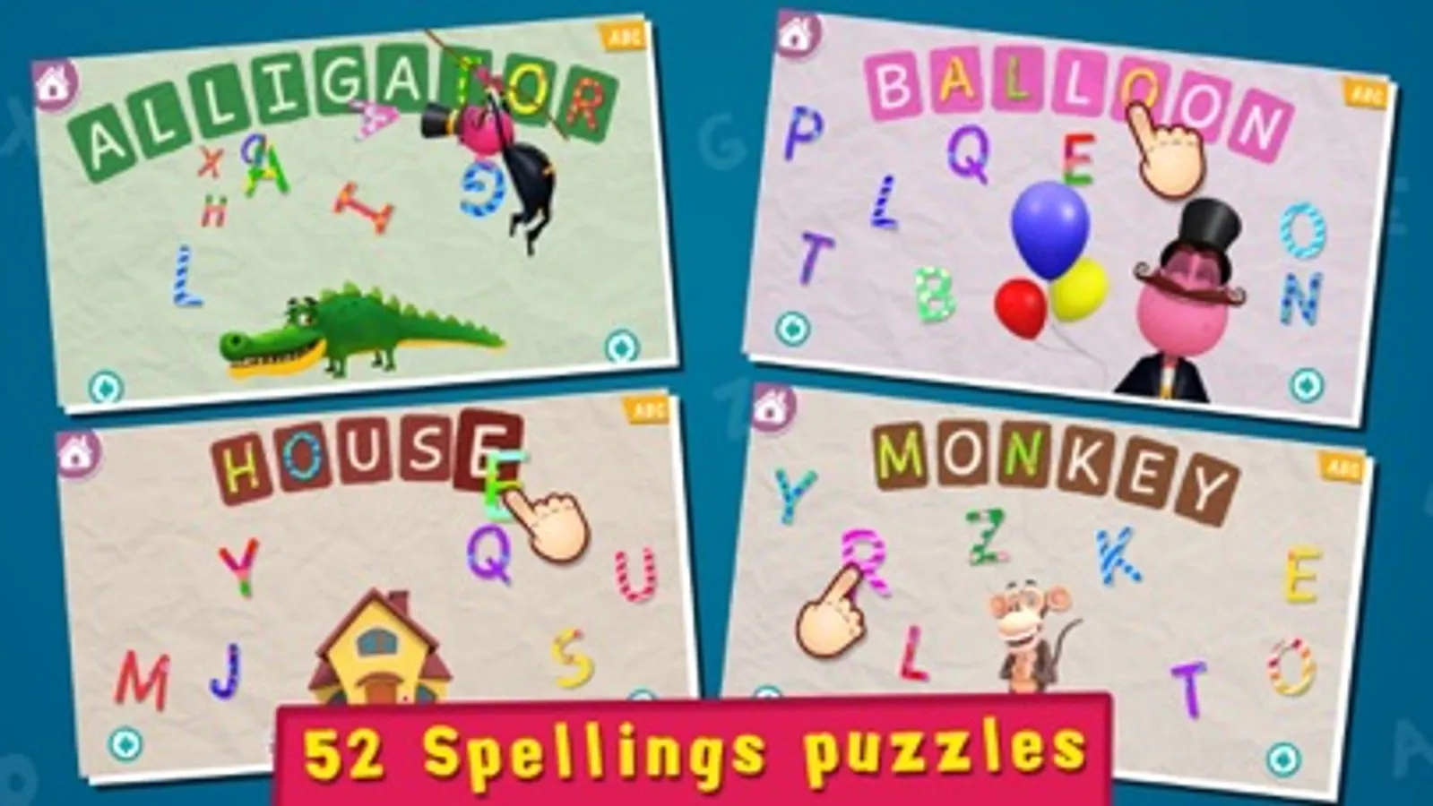 2. 52 Spelling pages where kids drag letters in place to spell the words while listening to their names and phoenic sounds along with delightful animations