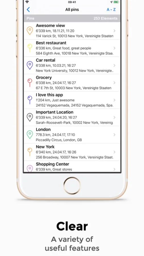 - List of all pins with search function - alphabetically, by distance, by date or sorted as desired