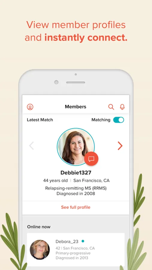 Let us connect you with a new member from our community every day. We’ll recommend members to you based on your treatment plan, lifestyle interests, and needs. Browse member profiles and request to connect with anyone from our community with members listed as “Online now.”