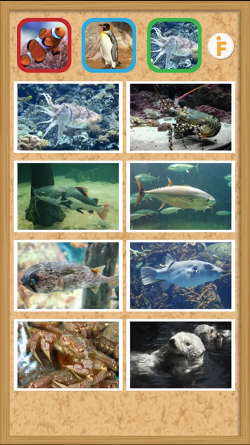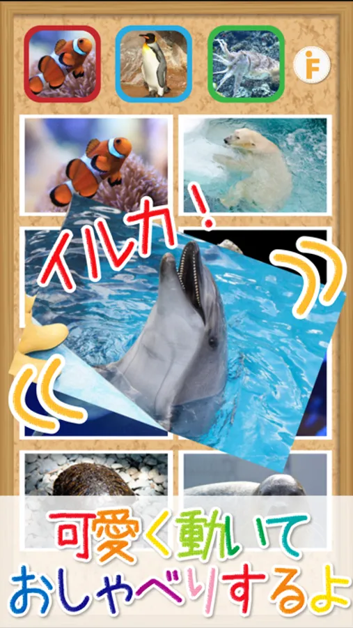 イルカなどの写真をタッチすると、写真がアップになり動きながら「イルカ」とおしゃべりして可愛い音がなります。