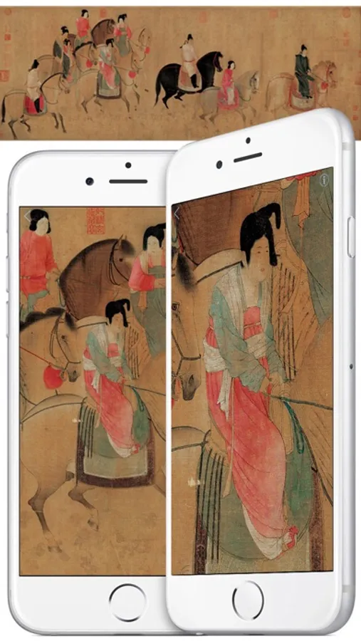 It depicts that Duchess Guo (the central one in a blue upper garment and a red wrap-around skirt ) riding a horse to enjoy the outdoors in spring, 752. The painting was redrawn a couple of copies by the royal painters in 1107, but only one copy survived 900 years as shown here. All the people in the picture are women, some of whom wear men's clothes. At the time, it was stylish for women to wear the men's clothing. They were even able to play polo with men as well.