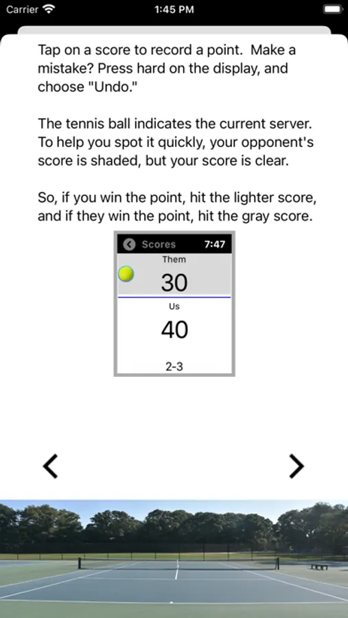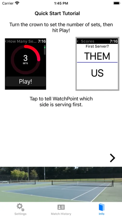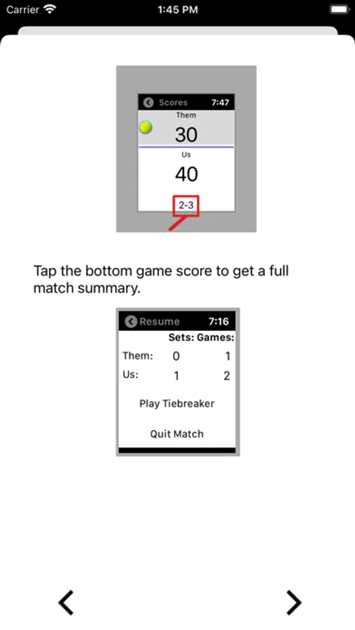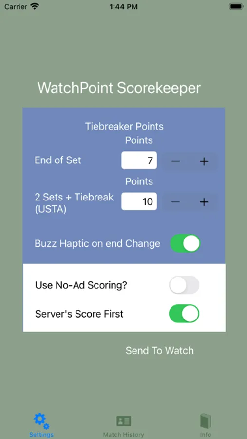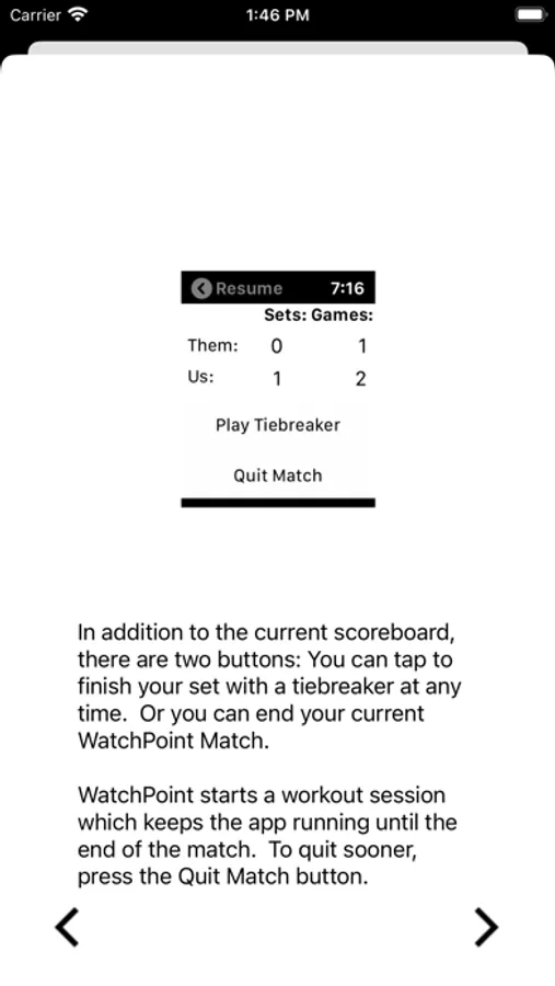 Start WatchPoint, select the number of sets you intend to play, and hit play. Tap on the winner's score after each point to add that point to the score. Watchpoint displays the score in brilliant large type that's easy to read, even in direct sunlight. Hit the wrong score? Just do a deep press on the watch to bring up the Undo menu. If the end of the set is tied, you get to choose between scoring using normal win by two or using a tiebreaker. There's even a setting for no-ad scoring and to adjust the number of points for a tiebreaker.