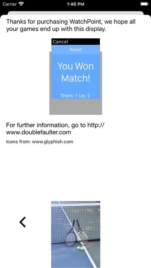 It's hard to remember the score in tennis, especially after a long point which distracts everyone. Use WatchPoint to keep track of the score on your Apple Watch as you play. WatchPoint keeps track of the game score, number of games and sets won.