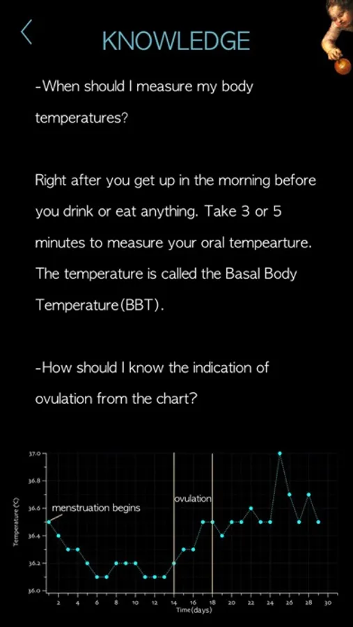 Right after you get up in the morning before you drink or eat anything. Take 3 or 5 minutes to measure your oral temperature. The temperature is called the Basal Body Temperature(BBT).