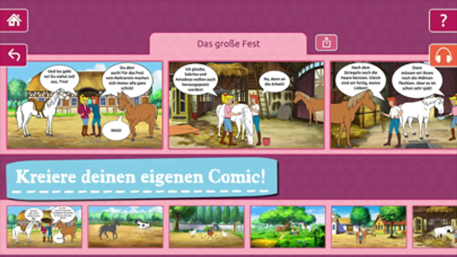Erfinde deine eigenen Comics mit Bibi und Tina, speichere diese, drucke sie aus oder versende die Geschichten an deine Pferde-Freundinnen! An allen Orten auf dem Martinshof kannst du Bilder erstellen, aus welchen du anschließend deinen Comic basteln kannst. Dazu stehen dir verschiedene Figuren, Pferde, Tiere und Gegenstände zur Verfügung.