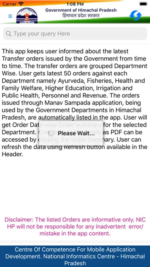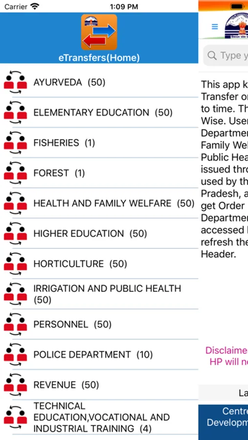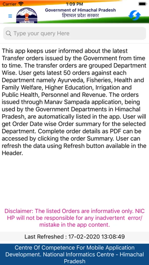 This app keeps user informed about the latest Transfer orders issued by the Government from time to time. The transfer orders are grouped Department Wise. User gets latest 50 orders against each Department namely Ayurveda, Fisheries, Health and Family Welfare, Higher Education, Irrigation and Public Health, Personnel and Revenue. The orders issued through "Manav Sampada" application, being used by the Government Departments in Himachal Pradesh, are automatically listed in the app.