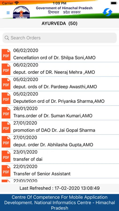 User will get Order Date wise Order summary for the selected Department. Complete order details as PDF can be accessed by clicking the order Summary. User can refresh the data using Refresh button available in the Header. Last accessed order list is saved with the app and can be accessed anytime even in offline mode.