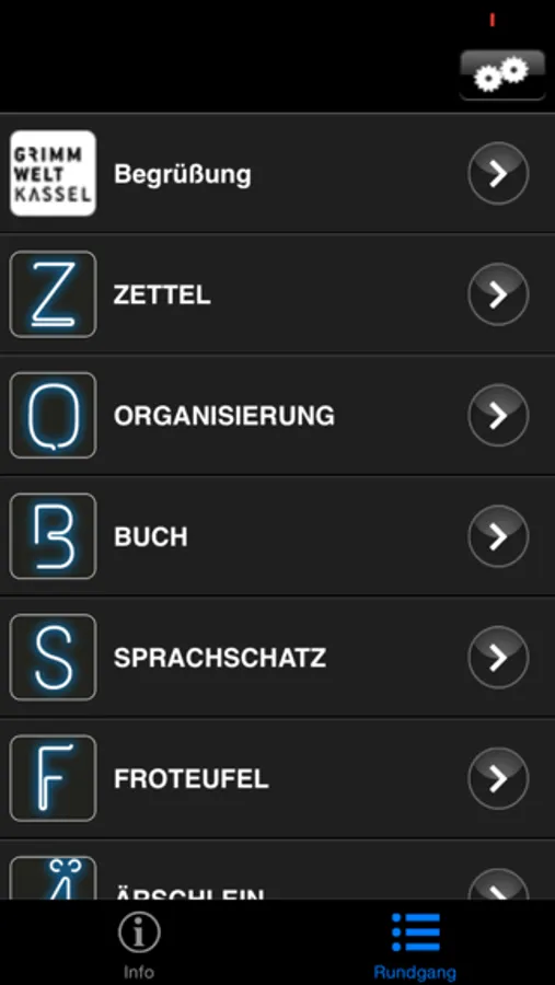 In der GRIMMWELT Kassel sind die Ausstellungstexte in deutscher und englischer Sprache abgebildet. Mit dieser App können Sie sich die Texte in Deutscher Gebärdensprache anschauen. Wählen Sie dazu in der Liste den jeweiligen Buchstaben zum Themenbereich während des Rundgangs aus. Zusätzlich bietet Ihnen die App zahlreiche Informationen rund um Ihren Besuch.
