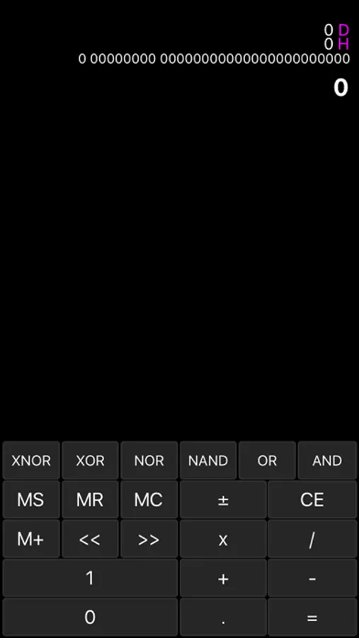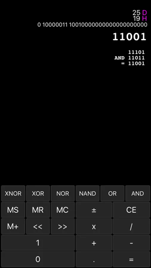 This calculator is able to calculate bitwise AND, OR, NAND, NOR, XOR and XNOR operations. Moreover, it is possible to perform bit shift operations (not available in watchOS version).