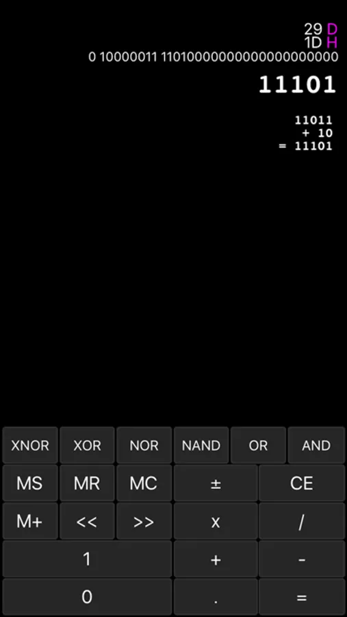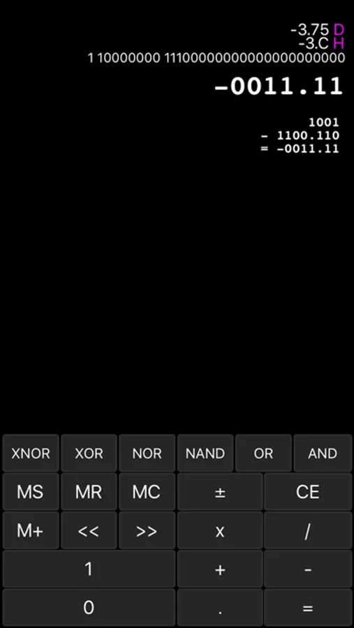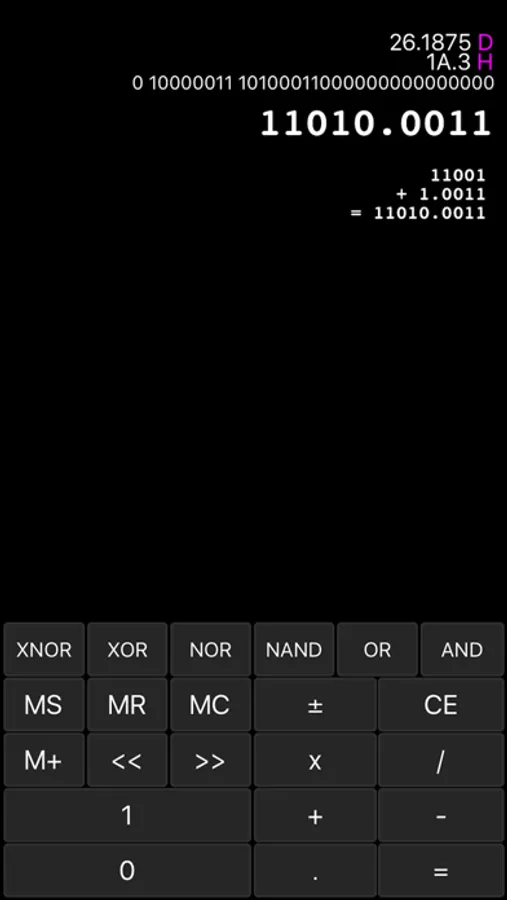 This is an arbitrary-precision binary calculator for iOS and watchOS. It can add, subtract, multiply, or divide two or more binary numbers. It can operate on very large integers and very small fractional values.