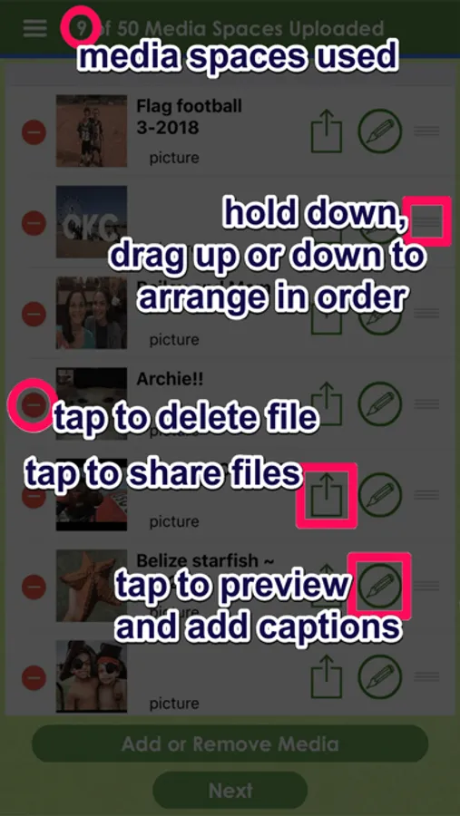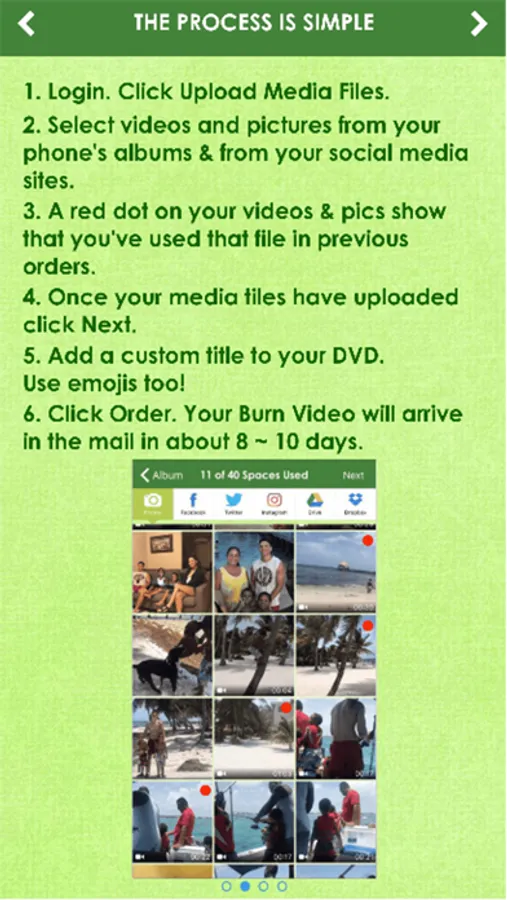 Check out our tutorial screen for a lot of cool features that we offer, including the ability to add text/caption along the bottom of your pictures and videos that play while you watch the DVD, the ability to move your videos around in the order of your choice, including chronological order and the ability to preview your videos and pictures before you add them to your order. And don't forget, you can upload photos and videos from your social media apps, like Facebook, Twitter, Instagram and more!