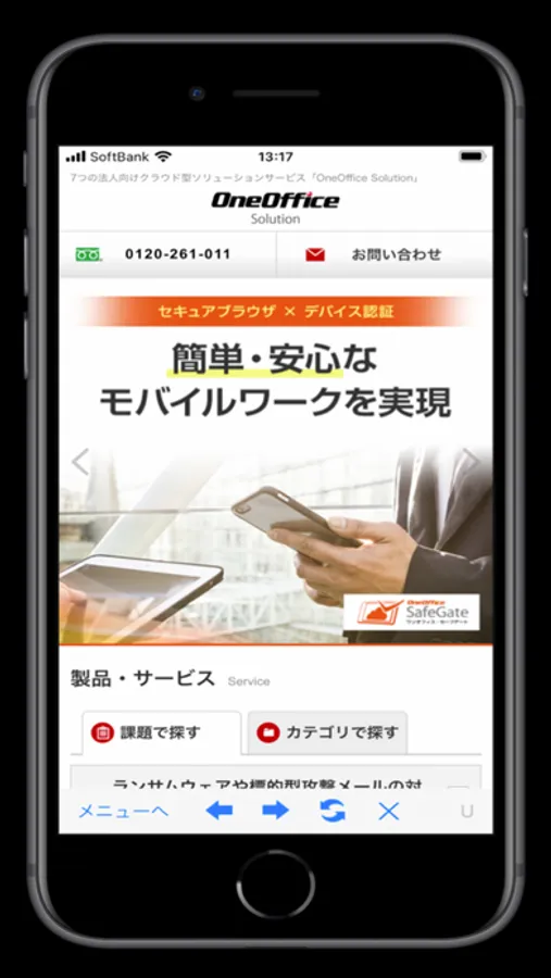 「OneOffice SafeGate for iOS」はあらかじめ使用許可されたiPhone、iPadからのみブラウザにログインできますので、不正アクセスを未然に防止します。合わせて、デバイス内にデータを残さないため、デバイスの紛失・盗難の場合にも情報漏洩を防ぎます。また、シングルサインオンにより、SafeGateにログインするだけで、クラウドサービスや業務Webシステムに接続できます。なお、通信経路はSSLで暗号化されていますので、安全にお使いいただけます。