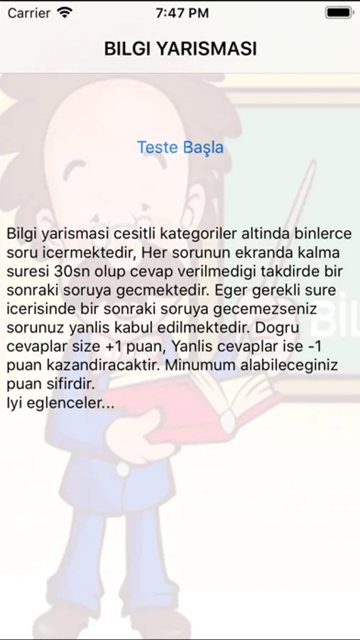Bilgi yarismasi cesitli kategoriler altinda binlerce soru icermektedir, Her sorunun ekranda kalma suresi 45sn olup cevap verilmedigi takdirde bir sonraki soruya gecmektedir. Eger gerekli sure icerisinde bir sonraki soruya gecemezseniz sorunuz yanlis kabul edilmektedir. Dogru cevaplar size +1 puan, Yanlis cevaplar ise -1 puan kazandiracaktir.