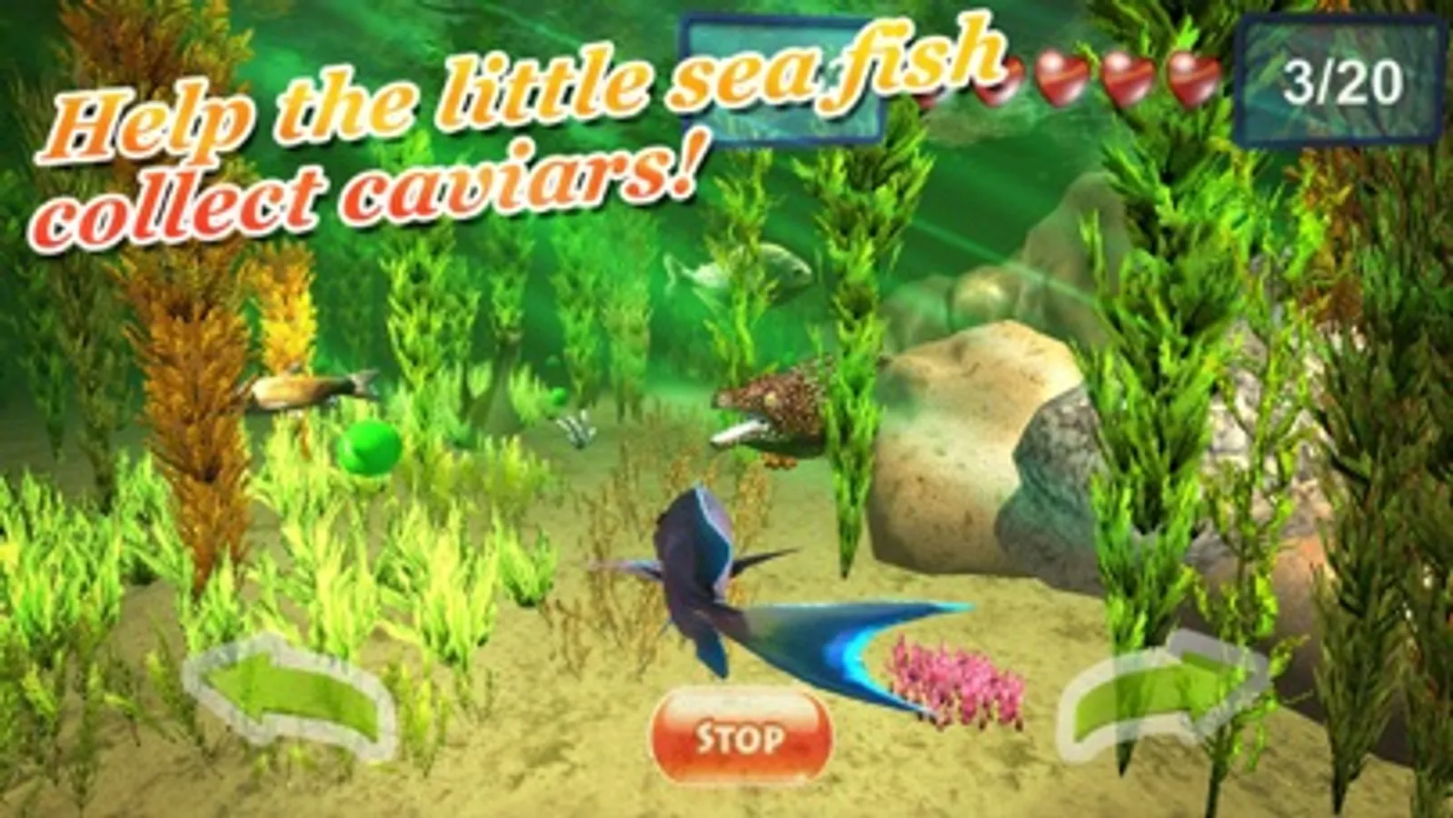 Help the little sea fish collect caviars. The sea is full of dangers, and you are the only one who can overcome them all! Install the game and set sail for some adventures to the very bottom of the sea. You will have to maneuver between the bright seaweed in search of caviars. Just watch out – there is a lot of other fish around which aim to eat you! To escape from them, look for the mask – it will make you invisible for a few seconds. Catch a heart when you are about to run out of lives. And don't forget to keep an eye on the time - every second counts here. Each star you find will give you acceleration, and the watch will reset the timer. Lily Fish won't cope without you – install the game right now and you will never regret!