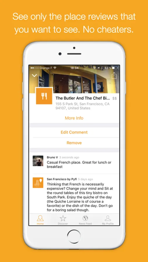 We like to go to places our friends suggested much more than to go to a place pushed by anonymous (and questionably trustworthy) sources. First, you know your friends and it's much easier to know why they suggest a place. You know their taste and you know if you trust their "best burger of the town" rating. It's a much more personal way of discovering new places. There is no "smart" algorithm in Pyfl that decides a restaurant is good for you.