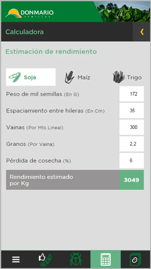 Además podrá contar con la información y fotos de las principales plagas y enfermedades que afectan al cultivo de soja, como así también en la sección cálculo de rendimiento estimar el rendimiento de su cultivo de manera simple y determinar la densidad óptima de siembra.