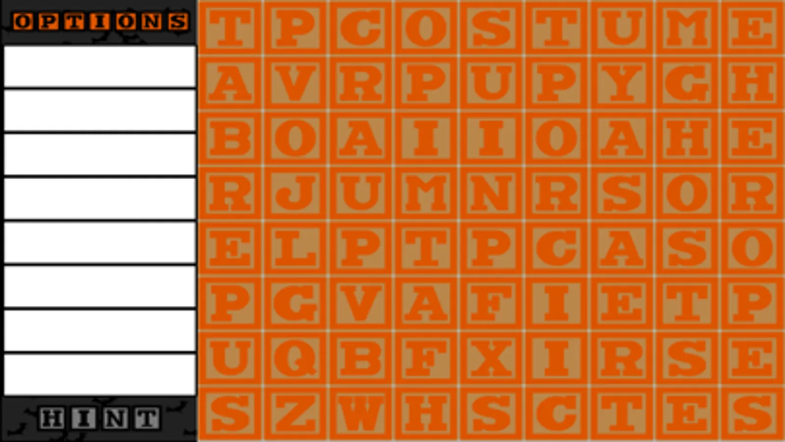 For an increased challenge you can turn the “Show Words” option off and seek out Halloween related words in the word search. If you need help when the Show Words option is off you can press the Hint button and the words on the left that need to be found will appear for a few seconds. This game also features twelve different backgrounds and various letter block colors that can be changed in the settings section. The letter blocks are big and bold for ease of use with eyes and fingers for kids and/or adults.