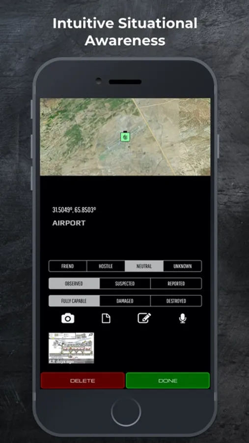 Conceived by senior leaders from the U.S. Special Operations Forces (SOF) community, SITREP allows for rapid data collection and streamlined report generation. SITREP is the first mapping tool that empowers the concept of Every Soldier a Sensor. The intuitive interface enables discreet, real time recon to boost effectiveness in the field. SITREP augments the standard functionality of data capture and storage with all the tools needed for Military, Law Enforcement, and First Responder operations.